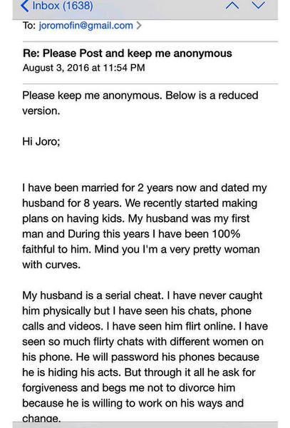 A woman is currently recovering from the shock of the s*xual contents she spotted on her husband's phone in a flirty chat with another woman. This disturbed woman whose husband seems unstoppable in cheating has written to Joro Olumofin to tell her story.