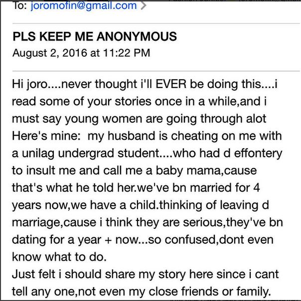 A married woman has opened up on her marital travails perpetrated by her cheating husband who is in a sizzling romance with an undergraduate.